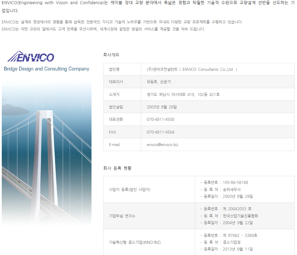 (주)엔비코컨설턴트는 다년간의 경험과 지속적은 기술개발을 통해 선진기술력과 대외경쟁력을 갖춘 교량 전문가 그룹으로, 케이블 지지교량(사장교, 현수교 등)의 설계 및 가설엔지니어링에 특화되어 있으며, 대표적으로 새천년 대교, 3rdBosphorus Bridge(튀르키예)의 설계와 1915 Canakkale Bridge(튀르키예)의 가설엔지니어링을 수행한 전문가 기업입니다.