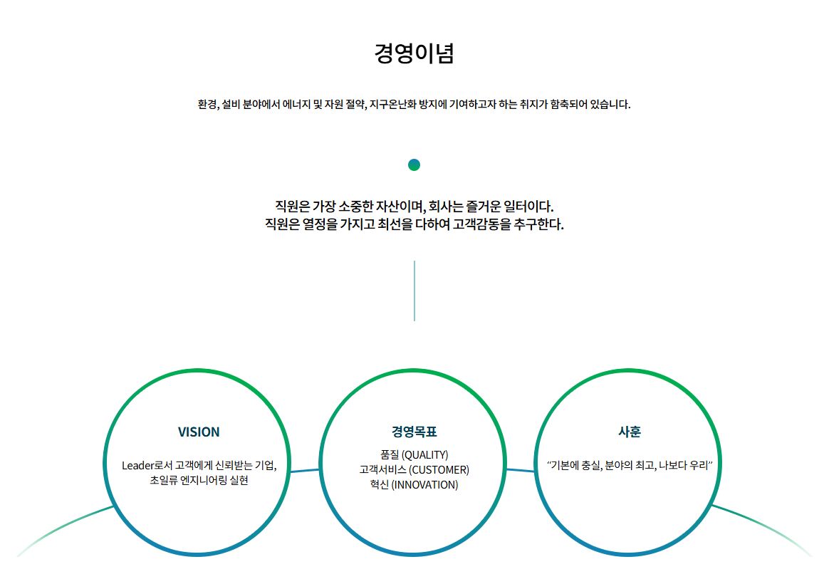 창립 이래 냉난방, 위생, 공기 조화 설비 등 건축기계설비와 클린룸, 항온항습실, 환경시험실 등의 산업환경설비, 또한 프로세스에서 필요로 하는 공기 조화, 냉동, 열유체 응용기술 및 에너지 이용 관련 시설 등의 기계기술을 서비스 하고 공기 조화 설비의 T.A.B & Commissioning을 통해 설계목적에 부합되도록 하는 T.A.B & Commissioning 업무를 수행중이며 또한 최근 관공서, APT, 공장 등의 성능개선 사업과 관련한 진단, 설계, 감리업무를 충실히 수행중에 있습니다.