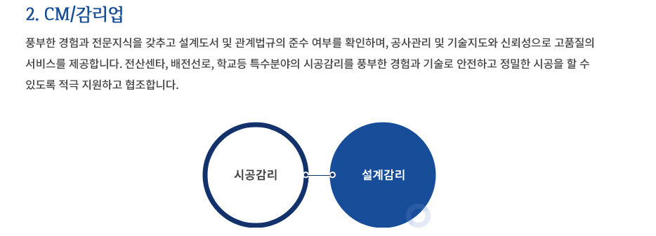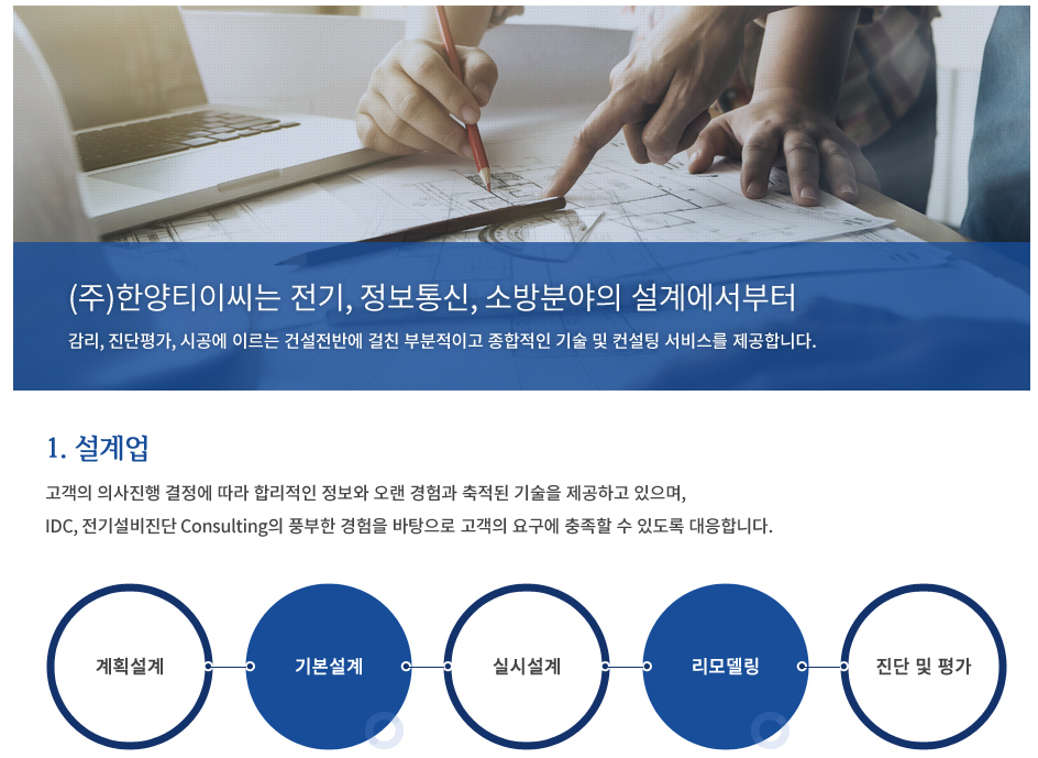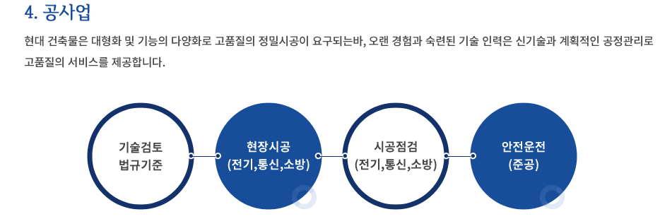 당사는 1981년도에 창립한 설계분야(전기, 정보통신, 소방), 시공분야(전기, 정보통신, 소방, 에너지, 해외건설)의 업면허를 보유하고 설계, 감리, 공사에 이르는 전과정의 종합적인 기술을 제공하는 전문 엔지니어링 회사로서 조달청, 지방자치단체, 국방부 뿐만 아니라 기타 건설업체의 업무시설, 공공업무시설, 주거시설, 상업시설, 문화시설 등 전 분야에 걸쳐 T/K, BLT, PF, 현상설계, 기술제안 등에 참여하고 있습니다.