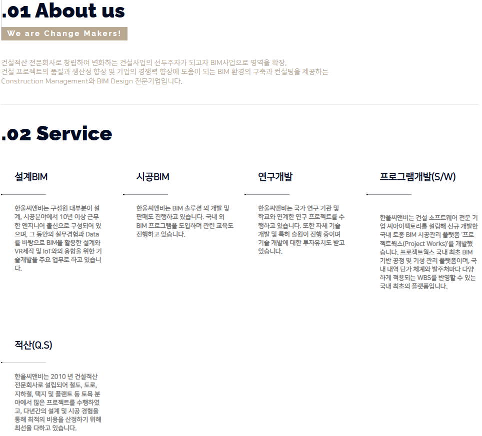 건설적산 전문회사로 창립하여 변화하는 건설사업의 선두주자가 되고자 BIM사업으로 영역을 확장하여, 기존의 3D모델링에 정보를 포함 4D(Schedule) , 5D(Cost)를 구현하여 독자적인 BIM Process를 구축하였습니다. 저희 회사는 건설 프로젝트의 품질과 생산성 향상 및 기업의 경쟁력 향상에 도움이 되는 BIM 환경의 구축과 컨설팅을 제공하는 BIM 전문기업입니다.